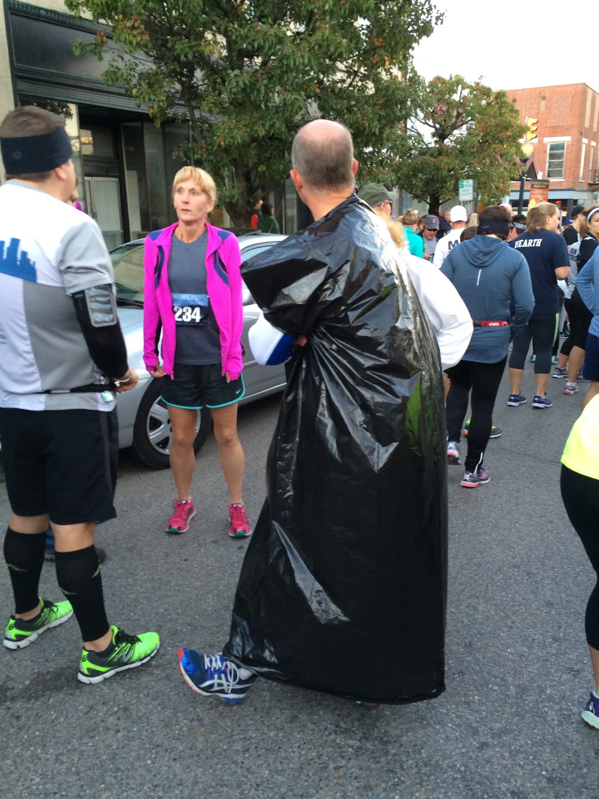 I didn't exactly make it to where TR had told me to park but I figured I was fairly close to the start line when I saw several runners in a bank parking lot. I found a spot on the side of the road and headed toward the music. I was about 1 1/2 blocks away. I saw the "Race Day Registration" sign but it didn't register that I would get my packet in that location. After walking around for a bit, I finally asked someone where packet pickup was and they pointed me back to the sign I had just walked past.